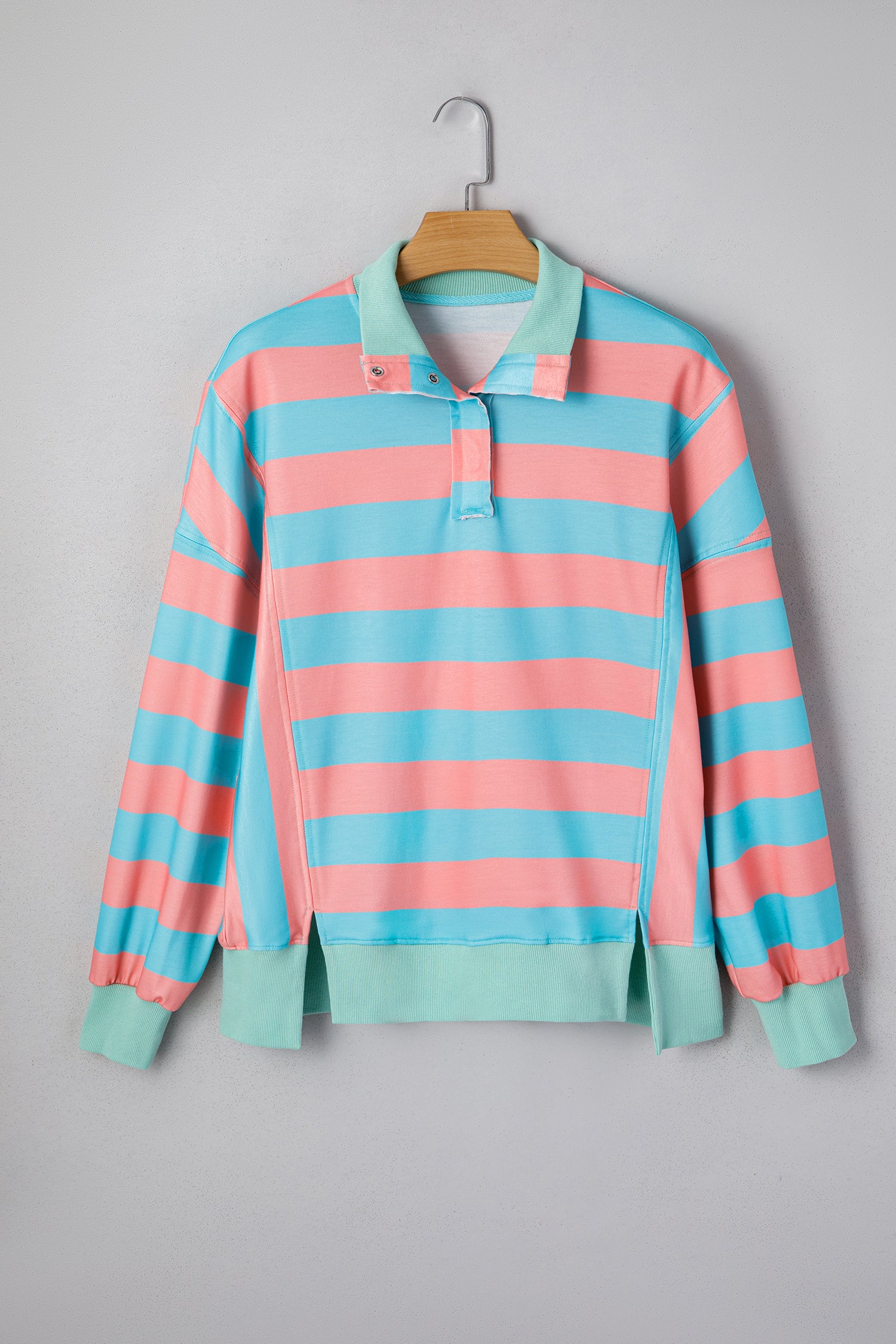 This modern striped top mixed with bold colorblock panels delivers standout style for busy moms who want to look effortlessly chic. The drop shoulder design adds relaxed comfort, perfect for long days on the go, while the buttoned collar detail creates a polished, versatile neckline that transitions seamlessly from playdates to meetings. Thoughtfully designed with a side slit hem, it offers easy movement and a flattering drape that flatters every figure. At RAD MOM Apparel, we celebrate stylish practicality, helping you feel confident and comfortable every step of the way. Embrace your bold, vibrant lifestyle with this must-have wardrobe essential.